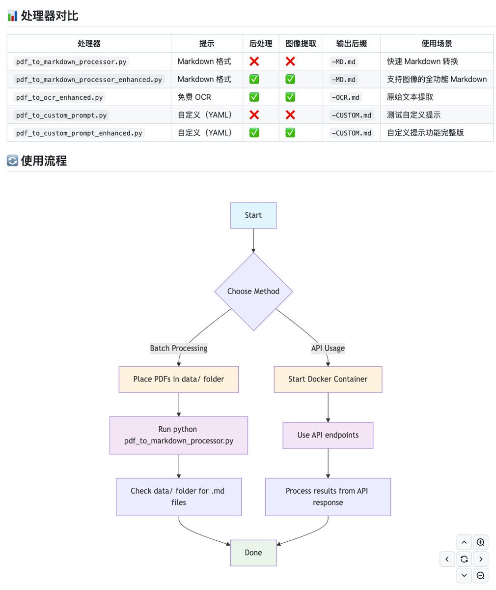 支持标准化的 Markdown 转换、纯 OCR 提取和自定义提示词处理等多种模式,以及批量处理多个文档。