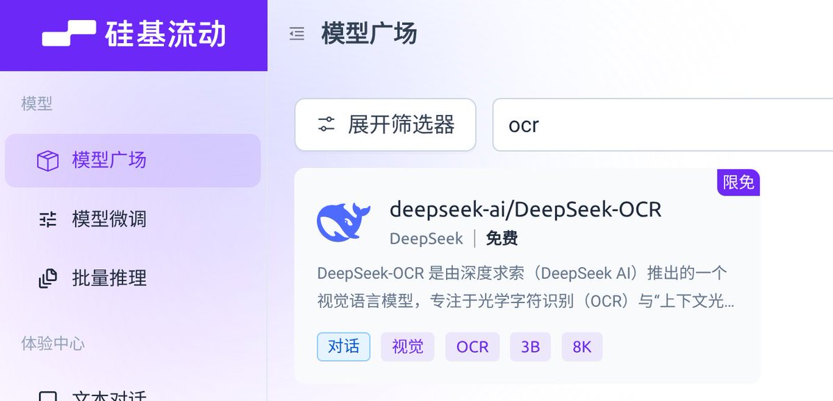 Deepseek OCR终于上硅基流动了,还没上Openrouter。我试一试爽一爽。